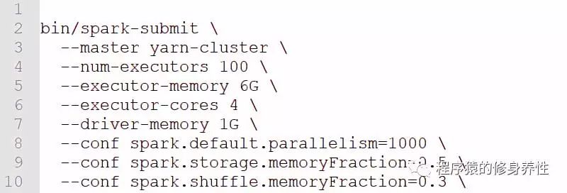 下图是一份spark-submit命令的示例,可供参考一下,并根据自己的实际情况进行调节: