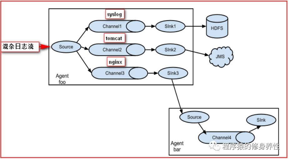Flume的数据流由事件(Event)贯穿始终,事件是Flume的基本数据单位,它携带日志数据(字节数组形式)并且携带有头信息。这些Event由Agent外部的Source生成,当Source捕获事件后会进行特定的格式化,然后Source会把事件推入(单个或多个)Channel中。可以将Channel看作是一个缓冲区,它将保存事件直到Sink处理完该事件。Sink负责持久化日志或者把事件推向另一个Source。