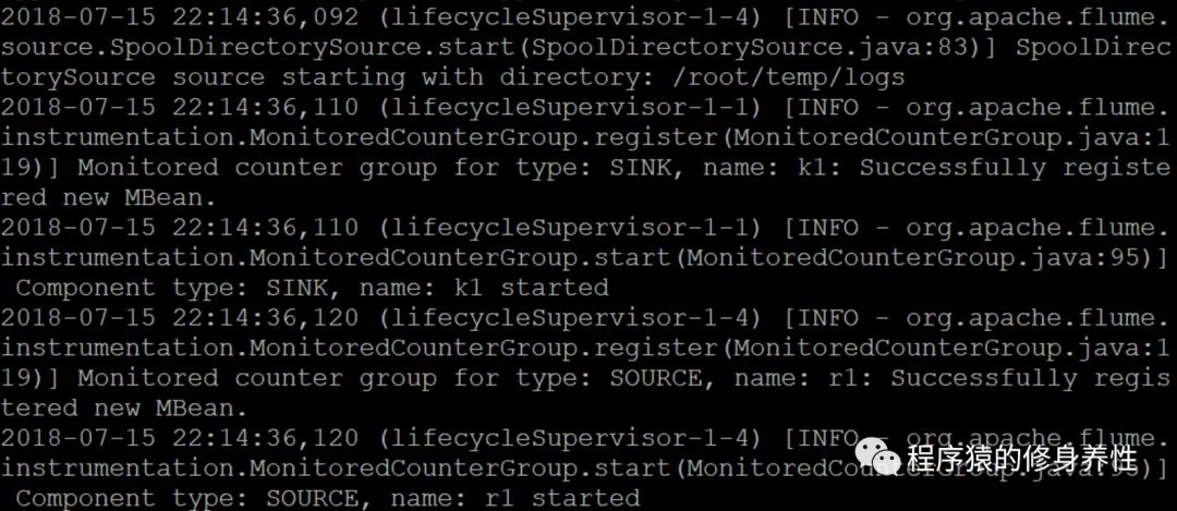 在目录/root/training/apache-flume-1.7.0-bin下,运行命令bin/flume-ng agent-n a1 -f MyAgent/a1.conf -c conf -Dflume.root.logger=INFO,console,从log中可以看到自定义的r1(Source组件)、c1(Channel组件)、k1(Sink组件)已经启动,如下图所示: