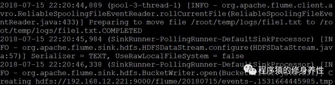 然后,将/root/temp目录下的file1.txt文件(该文件中的内容为MapReduce is simple),拷贝到被监听目录/root/temp/logs下,输出的log信息如下图所示: