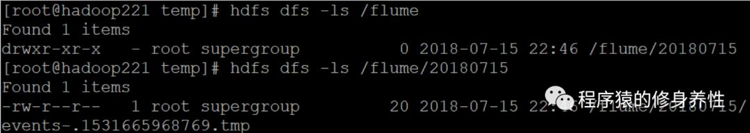 拷贝完文件之后,迅速(保证在启动上面那条长长的命令后的60秒钟之内)去查看HDFS对应目录,如下图所示,注意文件events-.1531664661571.tmp带有后缀tmp,表明是临时文件;等到超过60秒钟之后再去查看,发现该tmp后缀消失了,这个现象的产生,是由配置文件中定义的文件生成策略所决定的,要么生成的文件大小超过128M,要么时间超过60秒钟,才会生成最终的文件。