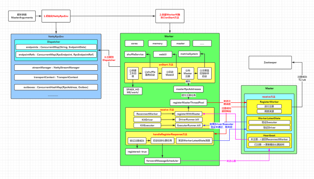 由于 Master 和 Worker 采用的是主从架构,所以 Worker 启动后最重要的事就是向 Master 注册,注册成功后定期发送心跳消息告诉 Master 自己活着。