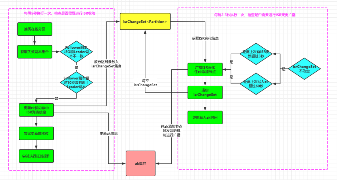 def maybePropagateIsrChanges() {//获取当前时间val now = System.currentTimeMillis()isrChangeSet synchronized {//广播ISR变化的条件://1.isrChangeSet不为空,即有分区更新了ISR列表// 2.1 距离上一次isrChangeSet更新的时间已经超过5秒( 上一次isrChangeSet更新的时间 + 5秒 < 当前时间)// 2.2 距离上一次写入ZK的时间已经超过60秒//IsrChangePropagationBlackOut 默认 5秒;IsrChangePropagationInterval 默认 60秒if (isrChangeSet.nonEmpty &&(lastIsrChangeMs.get() + ReplicaManager.IsrChangePropagationBlackOut < now ||lastIsrPropagationMs.get() + ReplicaManager.IsrChangePropagationInterval < now)) {//广播ISR列表的变化zkClient.propagateIsrChanges(isrChangeSet)//清空isrChangeSet集合isrChangeSet.clear()//更新写入ZK的时间lastIsrPropagationMs.set(now)}}}