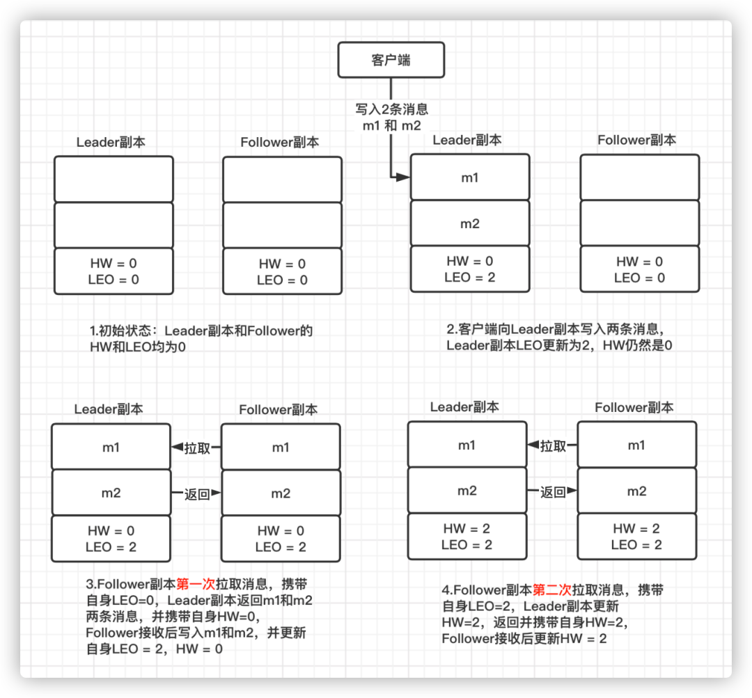 下面通过一个流程图来分析一下 Leader 副本和 Follower 副本的 HW 以及 LEO 的更新时机: