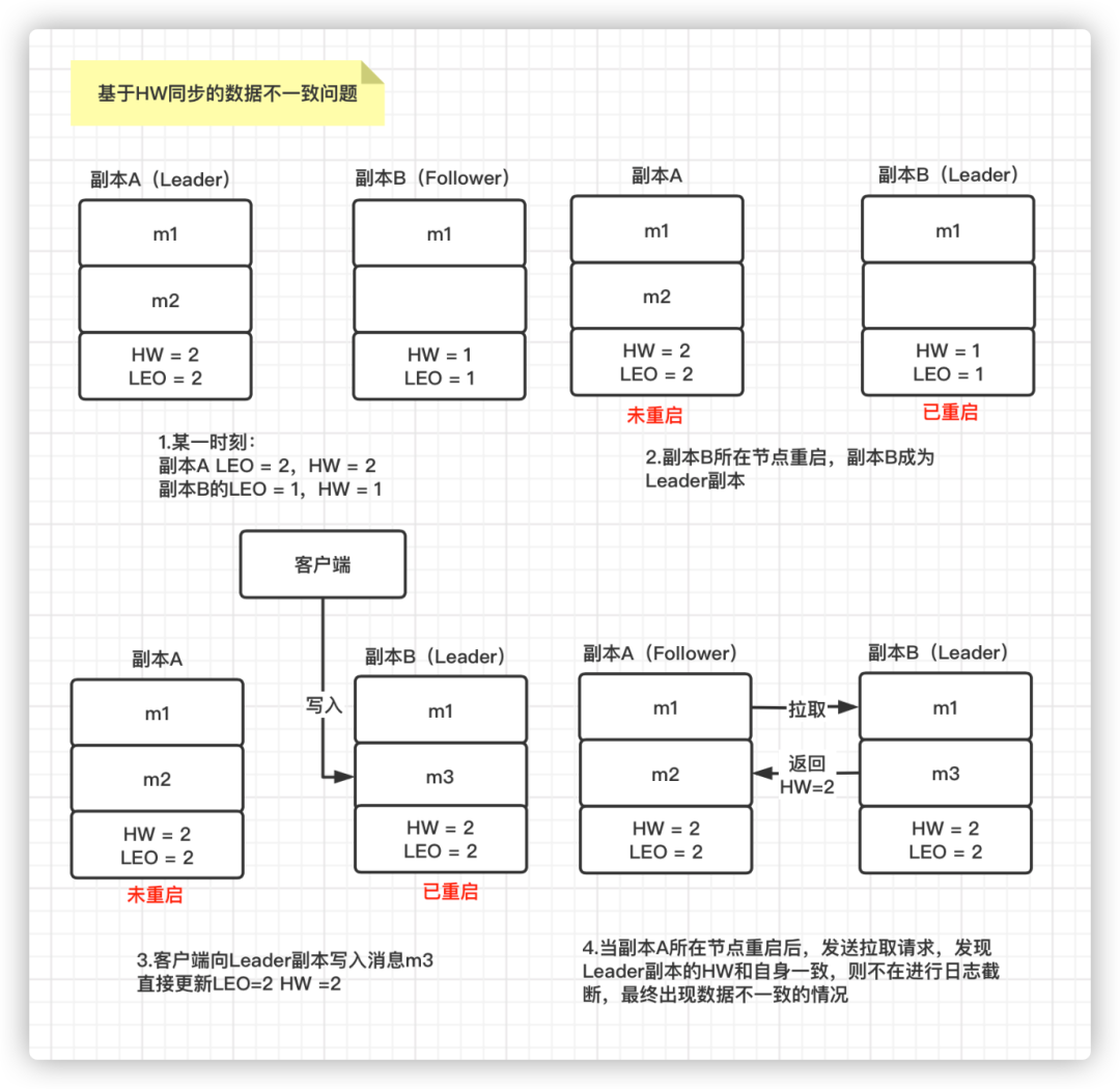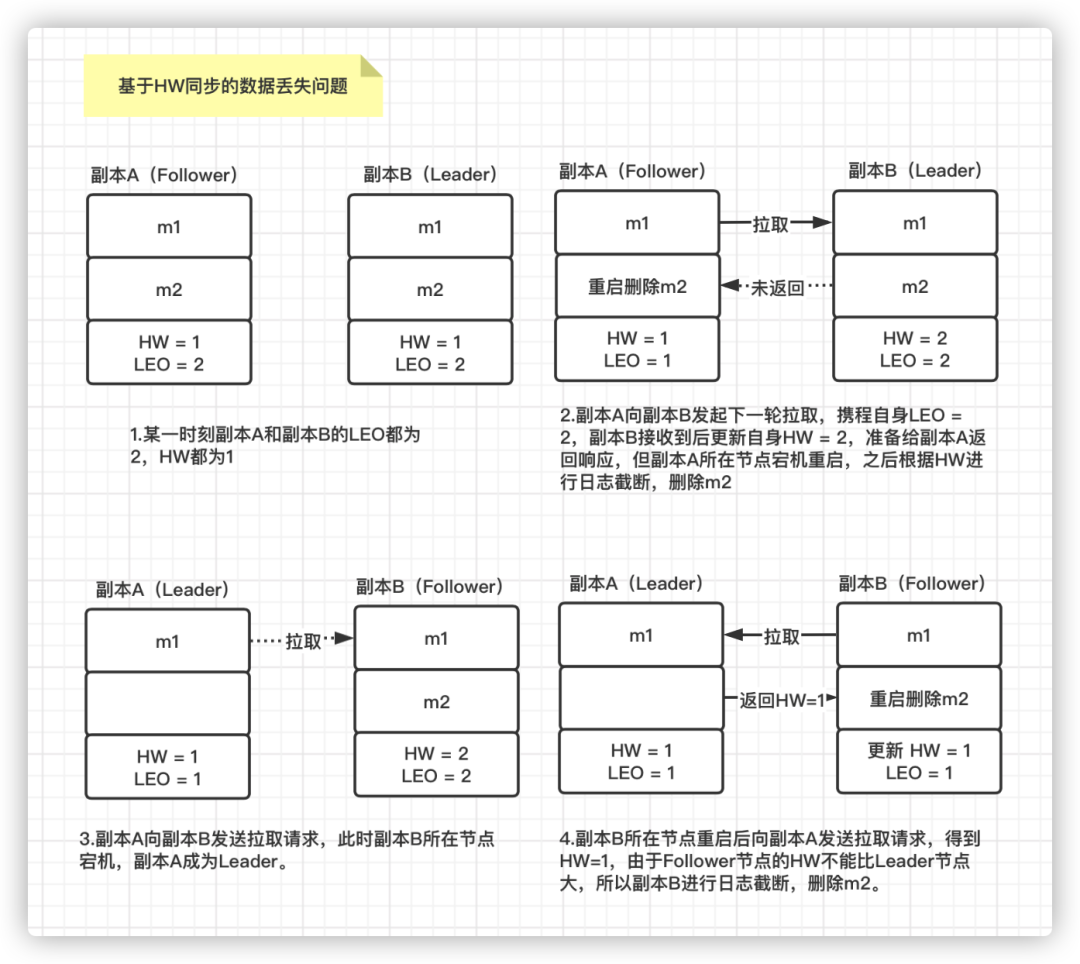 如果此时正好副本B 所在的节点也宕机了,那么原来的副本A 被选为 Leader 副本,其 HW =1。之后副本B 所在节点重启后,副本B 成为 Follower 副本,由于 Follower 副本的 HW 不能比 Leader 副本的 HW 高,所以副本B 还会进行一次日志截断,删除消息m2 并将 HW 调整为1。这就导致 m2 这条消息永远丢失了。