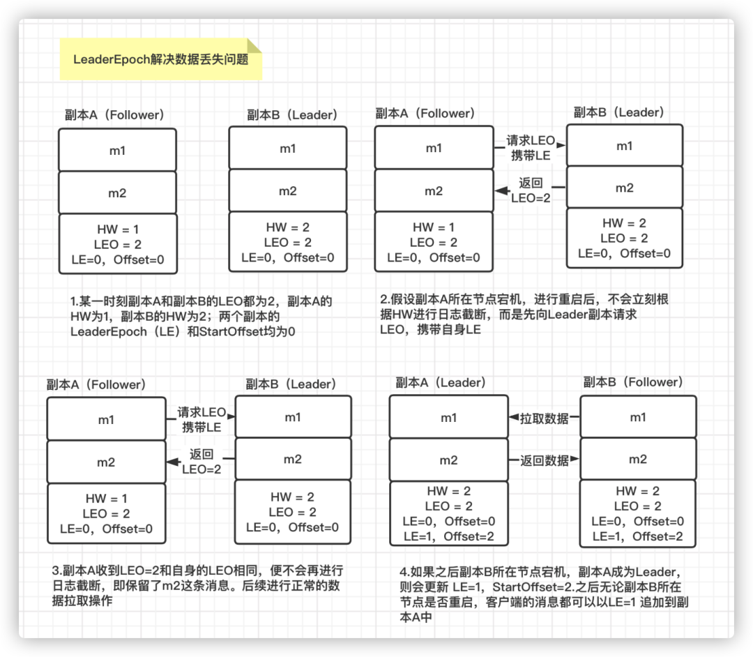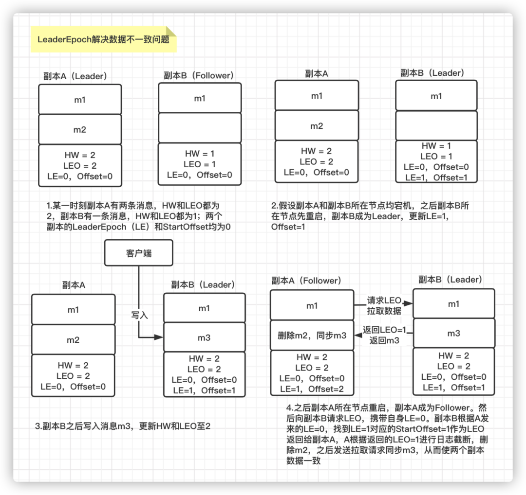 假设某一时刻,副本A 有两条消息 m1 和 m2,HW 和 LEO 均为2;副本B 有一条消息 m1,HW 和 LEO 均为1。两个副本的LeaderEpoch 和 StartOffset均为0,此时两个副本所在的节点均宕机。 随后,副本B 所在的节点先重启,副本B 成为 Leader 副本,将LeaderEpoch 和 StartOffset 更新为1。然后客户端向副本B 发送消息m3,副本B 写入后,将 HW 和 LEO 更新为2。 之后副本A 所在的节点进行重启,副本A 成为 Follower 副本。然后向副本B 发送 OffsetsForLeaderEpochRequest 请求,携带自身的LeaderEpoch=0。副本B 根据收到的副本A 的 LeaderEpoch=0,发现和当前自身的 LeaderEpoch=1 不一致,则将自身 LeaderEpoch 对应的 StartOffset = 1 作为副本A 的LEO 返回。 副本A 根据返回的 LEO =1 进行日志截断,删除消息 m2。随后副本A 正常向副本B 拉取数据,同步消息m3,更新自身 HW 和 LEO 为2。至此,通过 LeaderEpoch 机制就解决了两个副本数据不一致的问题。