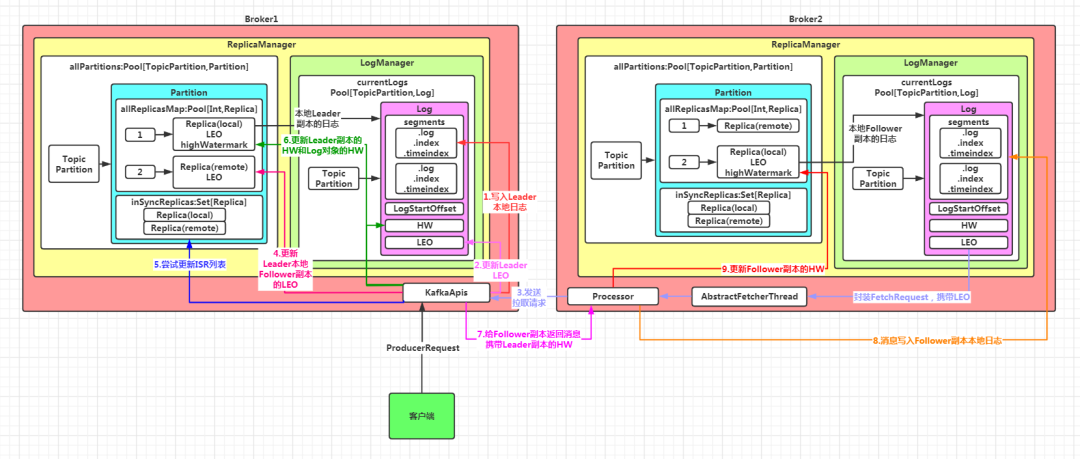Follower副本的相关操作:即 第三步、第八步、第九步 Leader副本的相关操作:即 第四步、第五步、第六步、第七步