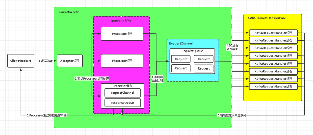 SocketServer:实现Reactor模式,用于处理多个Client(包括客户端和其他broker节点)的并发请求,并将处理结果返回给Client KafkaRequestHandlerPool:Reactor模式中的Worker线程池,里面定义了多个工作线程,用于处理实际的I/O请求逻辑。