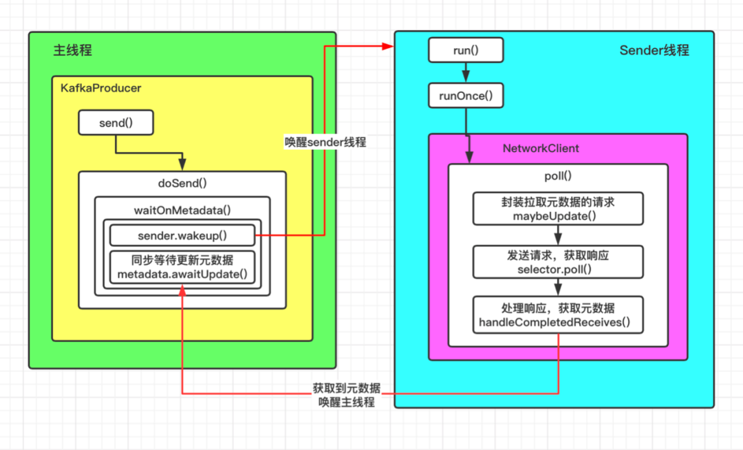 这里重点分析主线程和Sender线程的切换,集群元数据的获取是通过Sender线程完成的。