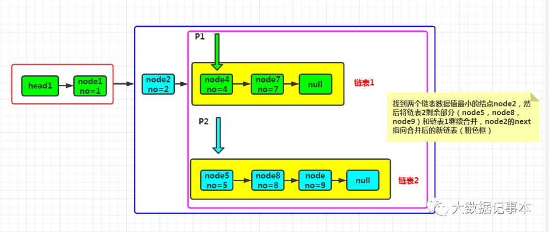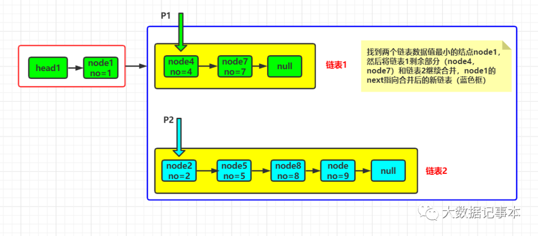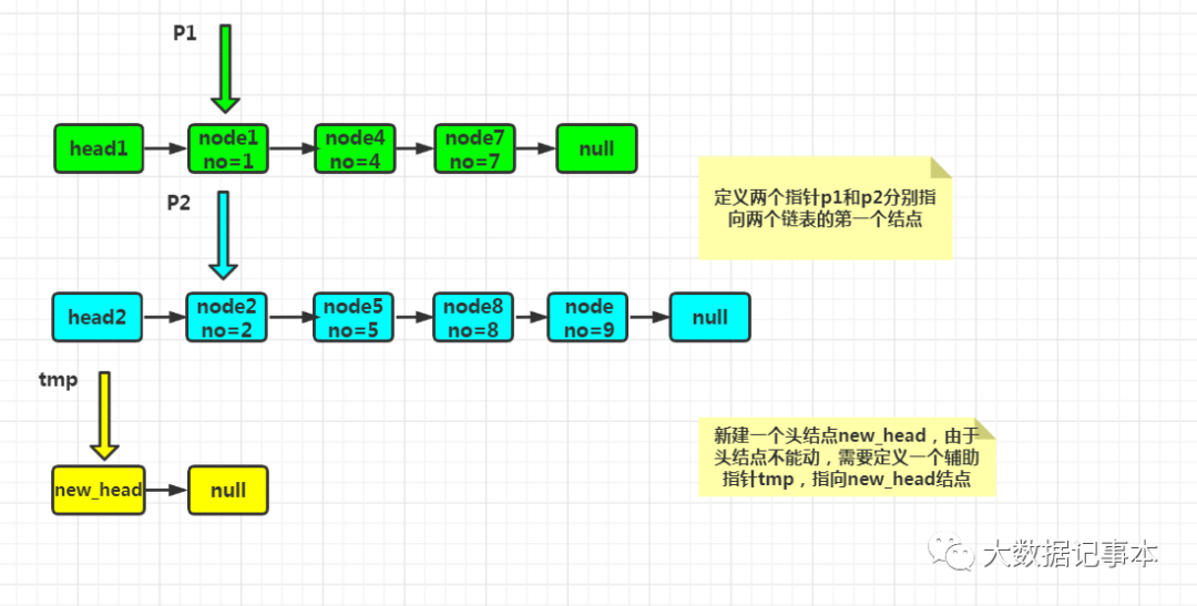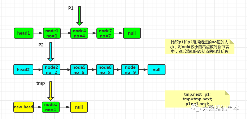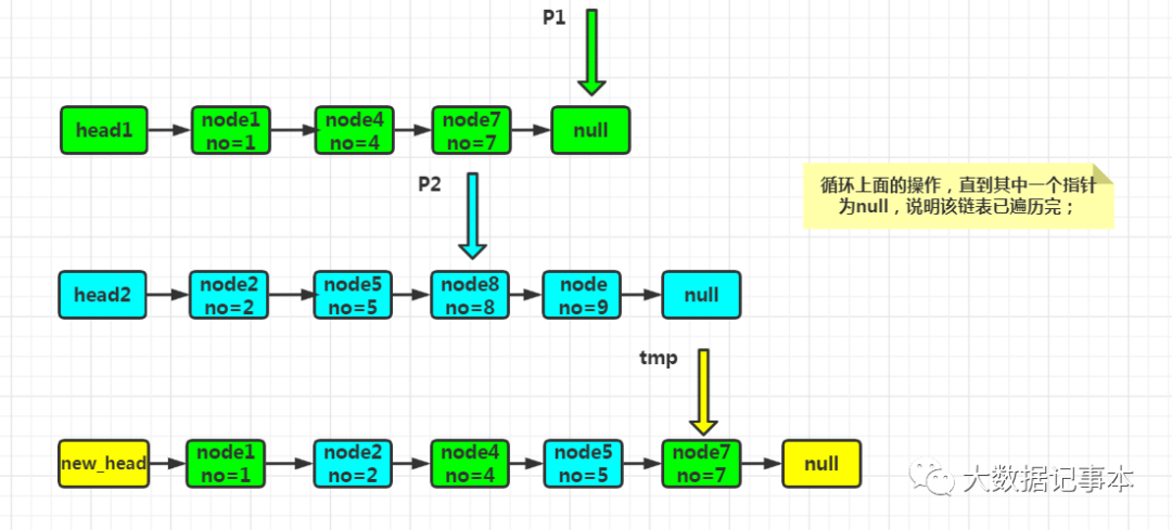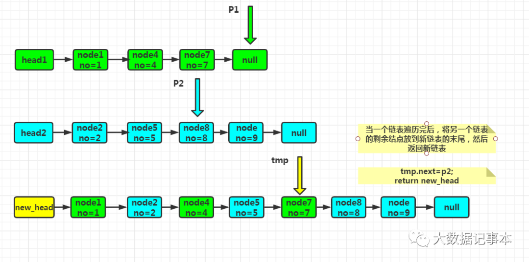 public static Node mergeSortedLinkedList(Node head1,Node head2){//如果有一个链表为空,直接返回另一个链表if(head1==null)return head2;if (head2==null)return head1;//新建一个头结点,并定义一个辅助指针tmpNode new_head = new Node(0);Node tmp=new_head;//两个指针分别指向链表的第一个结点Node p1=head1.next;Node p2=head2.next;//两个链表都没遍历完while(p1!=null&&p2!=null){if (p1.no<=p2.no){tmp.next=p1;p1=p1.next;tmp=tmp.next;}else{tmp.next=p2;p2=p2.next;tmp=tmp.next;}}//p1不为null说明第一个链表还有结点没遍历完,而第二个链表已遍历完//将剩余结点放在新链表的末尾if (p1!=null){tmp.next=p1;}if (p2!=null){tmp.next=p2;}return new_head;}