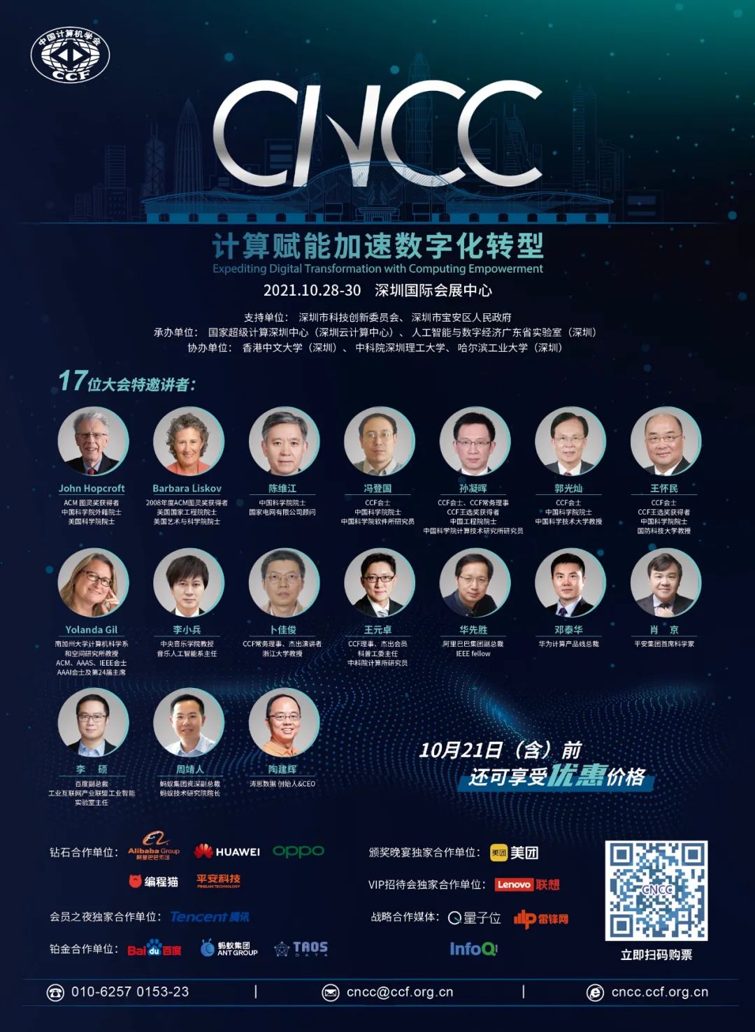 CNCC2021将于10月28-30日在深圳举行,今年大会主题是“计算赋能加速数字化转型”。CNCC是计算领域学术界、产业界、教育界的年度盛会,宏观探讨技术发展趋势,今年预计参会人数将达到万人。每年特邀报告的座上嘉宾汇聚了院士、图灵奖得主、国内外名校学者、名企领军人物、各领域极具影响力的业内专家,豪华的嘉宾阵容凸显着CNCC的顶级行业水准及业内影响力。