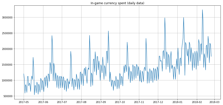 以下是时间序列样本图[11],显示了玩家在过去几年里每天花费在游戏中的货币。你能在这个数据中识别出上面列出的任何特征吗?