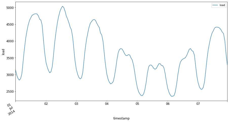 energy['2014-07-01':'2014-07-07'].plot(y='load', subplots=True, figsize=(15, 8), fontsize=12)
