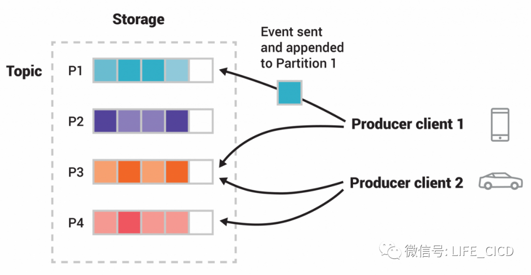 图:这个示例主题有四个分区P1 P4。两个不同的生产者客户端通过网络向主题的分区写入事件,从而彼此独立地向主题发布新事件。具有相同键的事件(图中通过它们的颜色表示)被写入同一个分区。注意,如果合适的话,两个生产者都可以写入同一个分区。