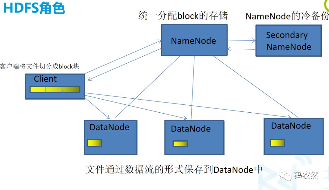 NameNode的作用是管理文件目录结构,接受用户的操作请求,是管理数据节点。 ① 文件目录与数据块之间的关系。是静态的,存放在磁盘上的,通过fsimage和edits文件来维护; ② 数据块与节点之间的关系。不持久放到磁盘,每当集群启动的时候,会自动建 立这些信息,所以一般都放在内存中。所以它是整个文件系统的管理节点。它维护着整个文件系统的文件目录树,文件/目录的元信息和每个文件对应的数据块列表,接收用户的操作请求。 ① fsimage(文件系统镜像):元数据的镜像文件。存储某一时段NameNode内存与元数据信息③fstime:保存最近一次checkpoint的时间DataNode的作用是HDFS中真正存储数据的。内部以block块为单位进行读写的,每128M数据为一个block块。(在hadoop目录下的core-default.xml文件中可以对参数dfs.blocksize的block块的大小进行具体设置)。hadoop -fs -touchz 创建空白文件