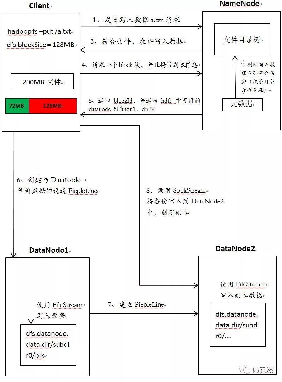 ①、使用HDFS提供的客户端开发库,向远程的NameNode中发送RPC请求②、NameNode会检查要创建的文件是否存在,创建者是否有权限进行操作,成功则会为文件创建一个记录,失败将抛出异常。③、当客户端开始写入文件的时候,开发库会将block块分成多个packets(信息包,默认64kb),并在内部以‘data queue’(数据队列:先进先出,且不带数据拷贝)的形式管理这些packets,并向NameNode申请新的Block,获取用来存储replicas(副本,默认是3)的合适的datanodes列表,列表的大小根据在NameNode中对replication的设置而定。④、开始以管道(pipeline)的形式将packet写入到replicas中。开发库以流的形式写入到第一个DataNode,该DataNode把该packet存储之后,再将其再次pipeline的下一个DataNode,直到最后一个DataNode,这种写数据的方式呈流水线的形式。⑤、最后一个DataNode成功存储后会返回一个ack packet(确认包),在pipeline中传递至客户端,在客户端的开发库中维护者ack queue,成功收到DataNode返回的ackpacket后会从ack queue中移除相应的packet。⑥、如果在传输过程中,有某个DataNode出现了故障,那么当前的pipeline会被关闭出现故障的DataNode会从当前的pipeline中移除,剩余的block会继续剩下的DataNode中继续以pipeline的形式传输,同时NameNode会分配一个新的DataNode,保持replicas设定的数量。
