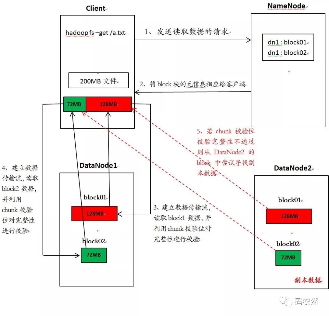 ①、client访问NameNode,查询元数据信息,获得这个文件的数据块位置列表, 返回输入流对象。②、就近挑选一台datanode服务器,请求建立输入流③、DataNode向输入流中写数据,以packet为单位进行校验