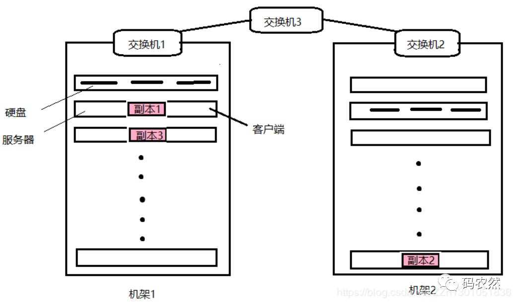 安全模式下用户可以进行的操作:不修改元数据的操作,例如ls查询、cat查看文件内容、get下载等。用户不能修改的只有抽象目录树。不可以进行的操作:修改元数据的操作。例如创建目录、上传、修改文件名、文件追加。 默认情况下,每个数据块有三个副本,这三个副本怎么存放呢? 第二个副本一般存放在与第一个副本不同机架的任意结点上 第三个副本一般存放在与第一个副本同一机架的不同结点上 原因:在风险度相同(第三个副本存放在机架1和机架2,机架断电的可能性相同)的情况下,优先选择网络传输少的。
