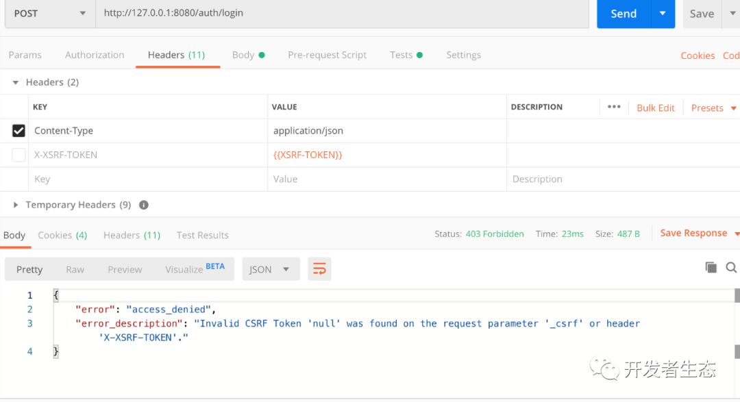 在PostMan中没有设置csrf的情况下如下图(不考虑安全的情况系后台可以禁用csrf)