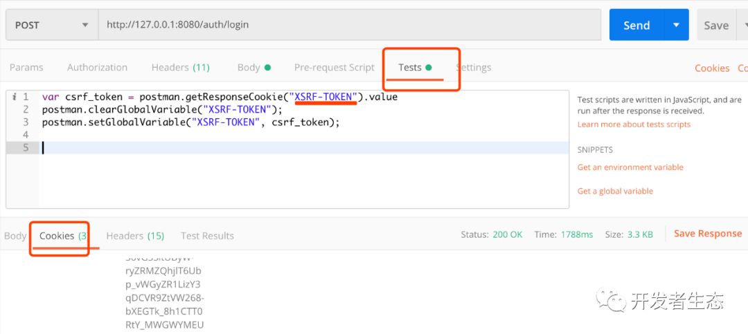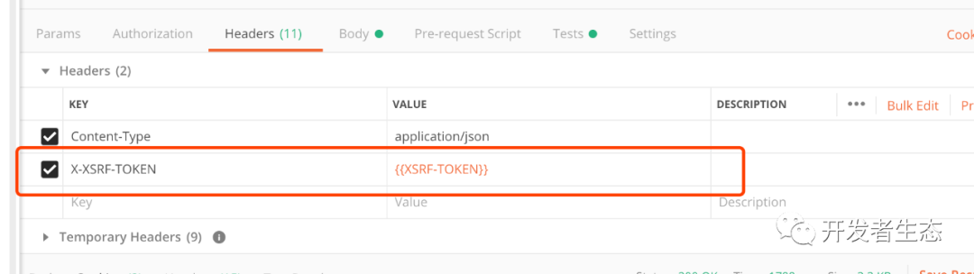 在【Headers】中获取变量“XSRF-TOKEN的值。获取值的方式:{{XSRF-TOKEN}}