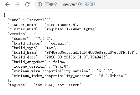 2、访问,在浏览器中输入 ip:9200或 host:9200即可显示以下内容