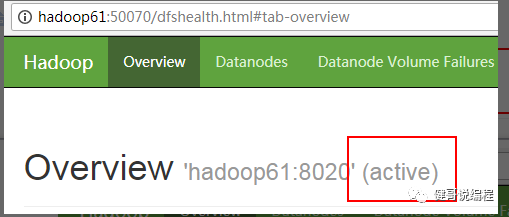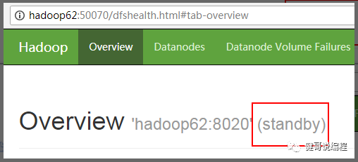 现在将hadoop61上的namenode进程使用kill -9杀死。然后再查看hadoop62上的namenode状态,可见已经成为active: