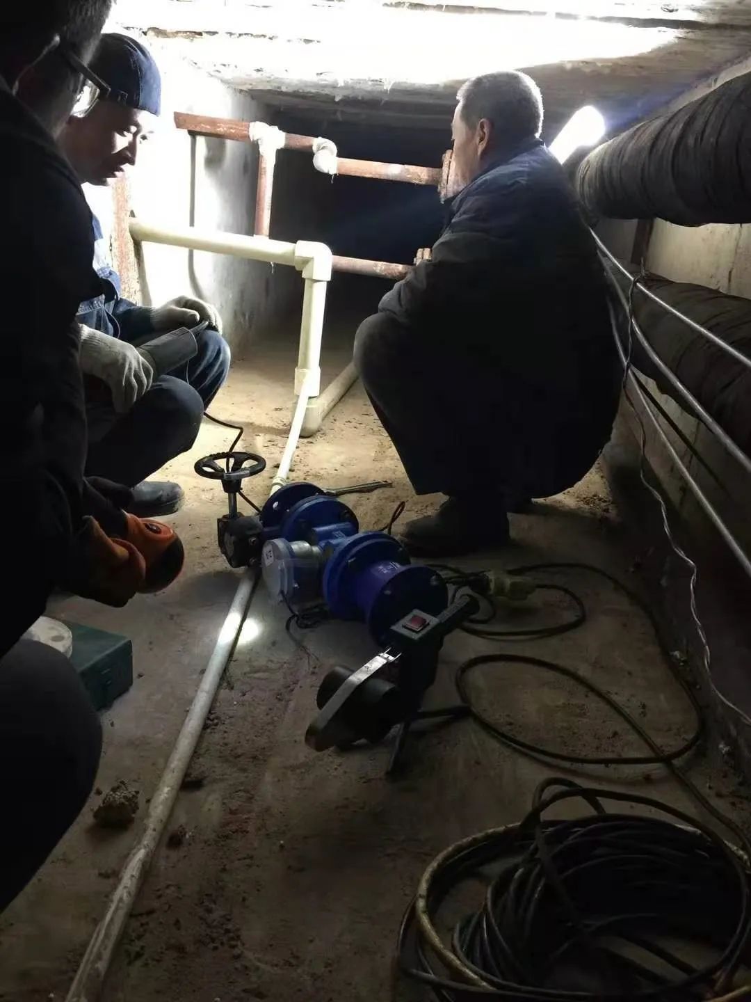 项目经理在地下井沟中现场指导水表安装。
