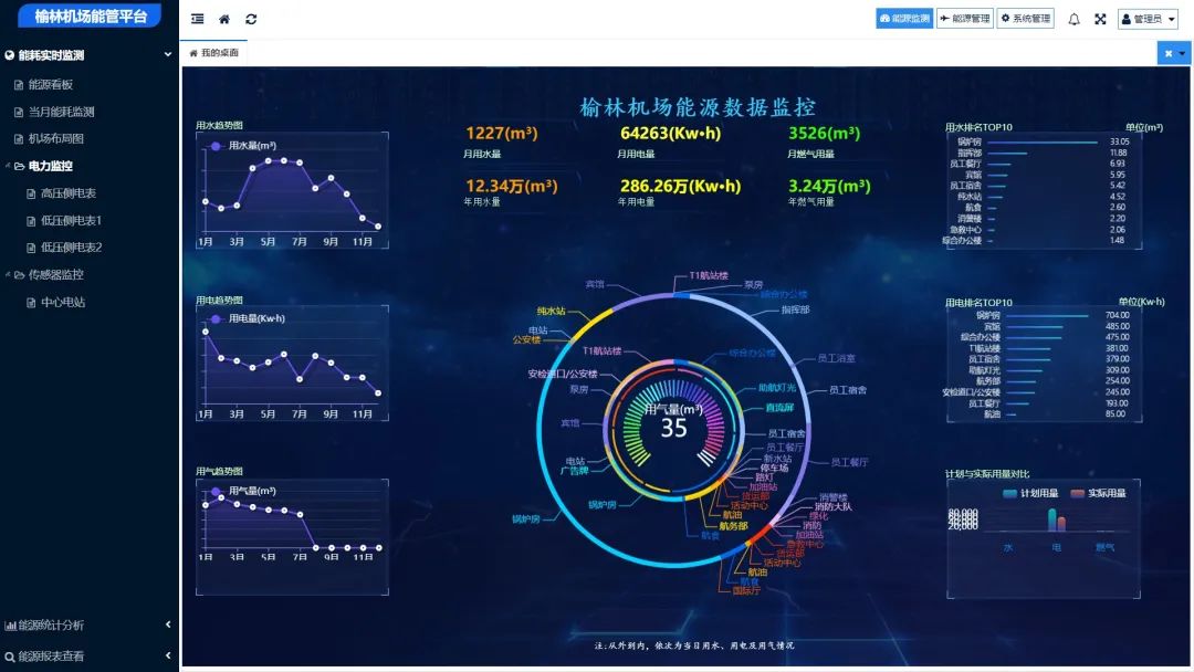 榆林机场能源管理平台驾驶舱。曲线及柱状图直观地展示重要数据信息。