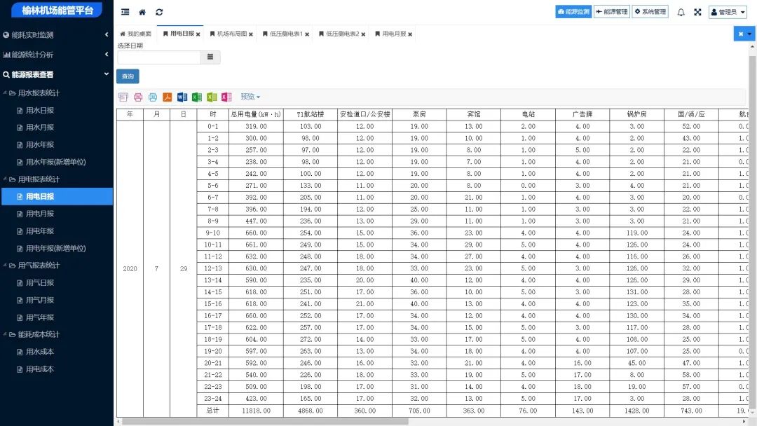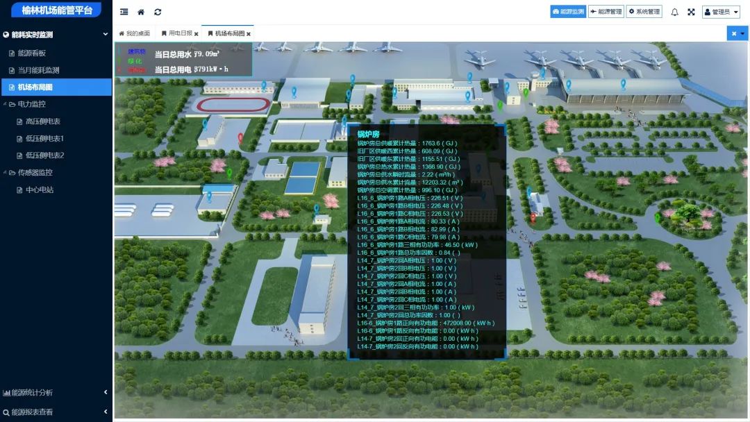 榆林机场能源管理平台基于组件化的开发平台,为机场提供生产实时监控、动态管理控制板块、实时决策调度、设备动态管理、用能预警、能源管理等生产应用模块,持续不断地改善生产过程,从而构建能源管理系统。