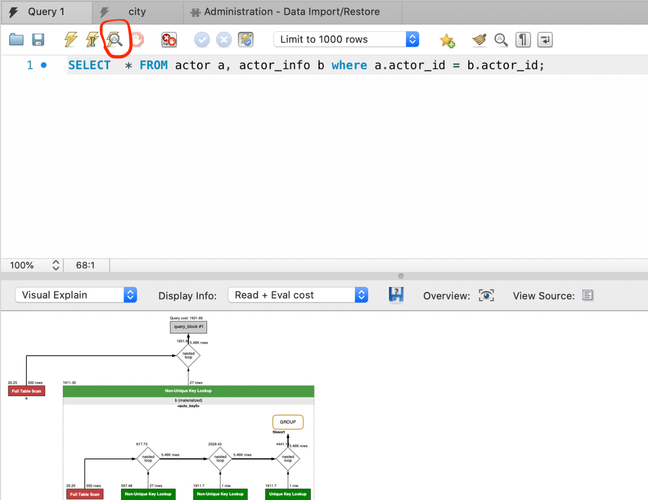 可视化输出,可以通过MySQL Workbench可视化查看MySQL的执行计划。通过点击Workbench的放大镜图标,即可生成可视化的查询计划。