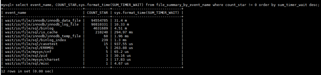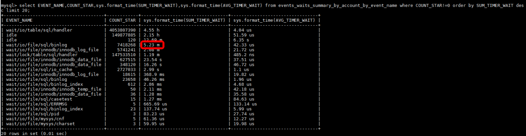 发现等待事件中最长的是binlog,虽然其时间比例在总时间中占比较低,但是数据库内部的等待视图看不到其他明显的问题,所以我们决定调整binlog相关的配置。