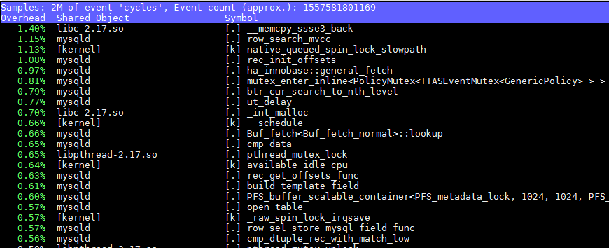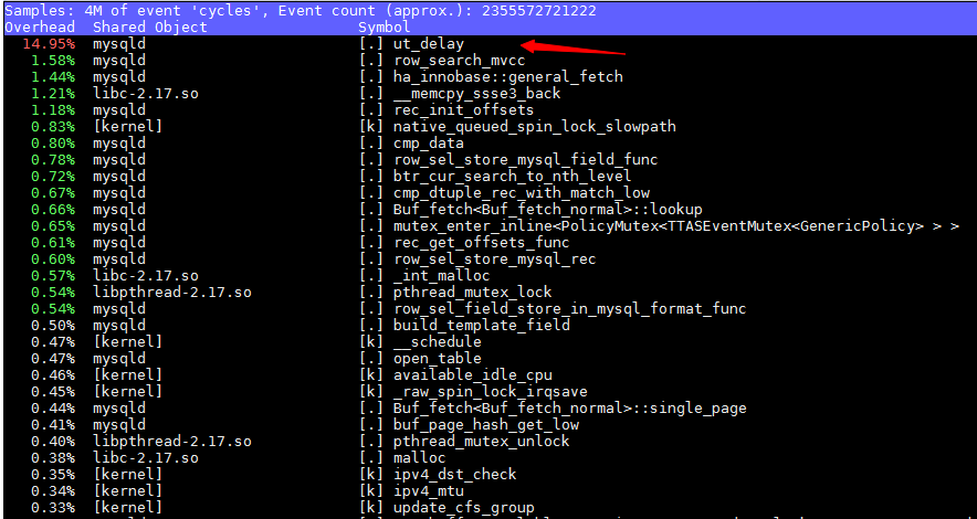 分析:再次观察系统资源情况,CPU利用率依然在50%左右,IO和网络没有压力,怀疑关键瓶颈是数据库内部的资源等待。但是数据库内部的等待事件列表已经看不出明显的问题,我们转而通过perf来继续查找根因,发现存在ut_delay的热点函数,所以判断是自旋锁相关的使用存在问题: