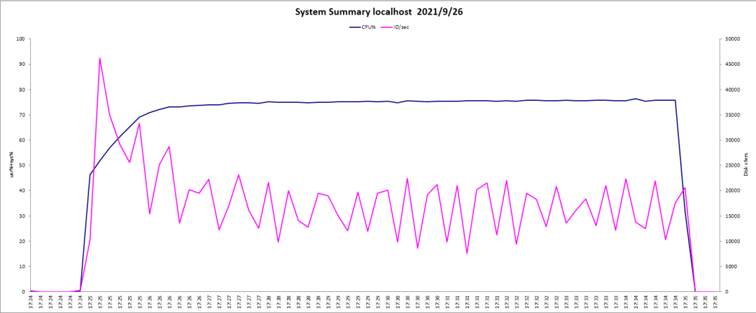 分析:观察系统资源使用情况,发现有大量磁盘IO事件。当前磁盘读写已成为制约系统性能的首要瓶颈,考虑通过增大共享内存的方式尽量将数据放入内存中进行操作以减小磁盘IO压力。
