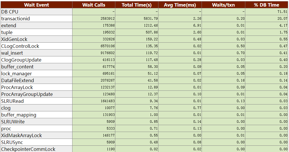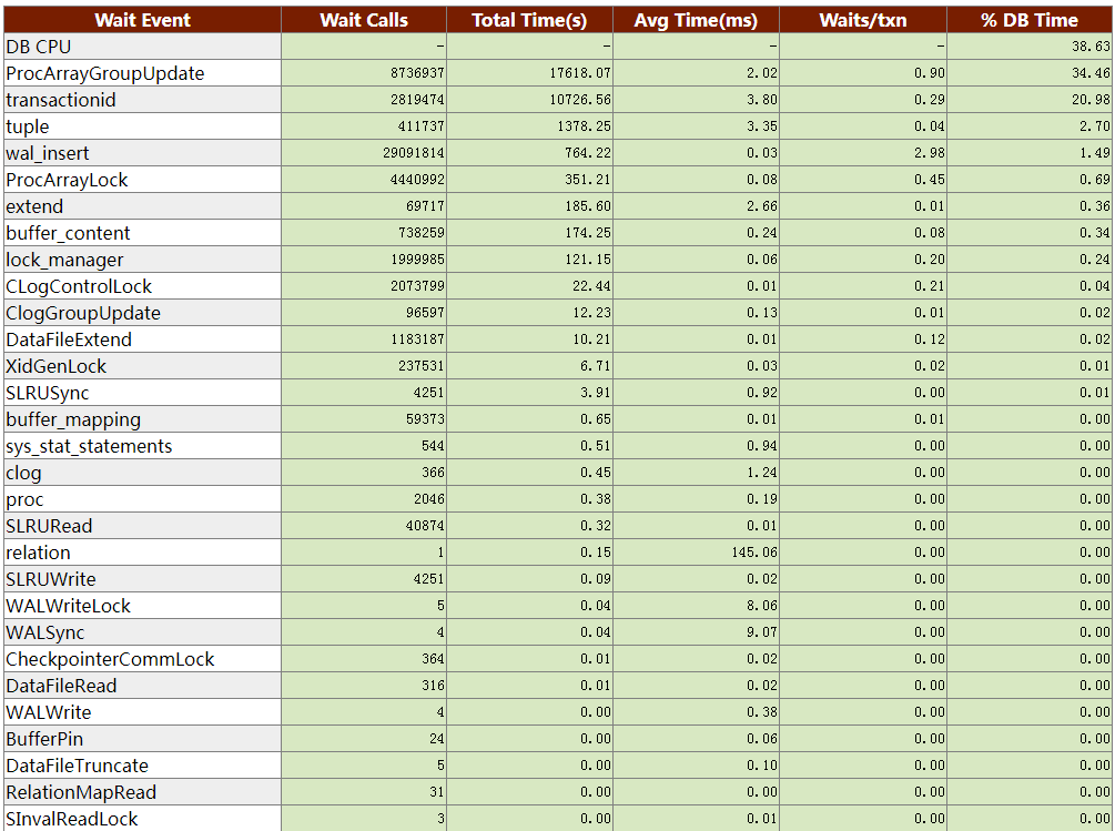 分析:观察此时数据库系统等待事件, ProcArrayGroupUpdate等待事件占据了34%的数据库时间,存在较为严重的性能问题。