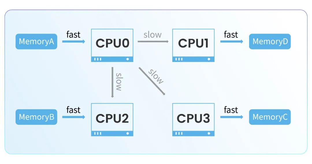 为了寻求算力上不断新的突破,CPU先是朝着“频率”的方向高歌猛跟进,但随着逐渐受到物理极限的挑战,转为向核数越来越多发展,但由于所有CPU核都是通过共享一个北桥来读取内存,核数的不断增多带来了北桥响应时间的瓶颈问题。于是技术人员另辟蹊径,即将内存平均分配在各个die上,由此CPU核发展进入NUMA(Non-Uniform Memory Access)化时代,如此虽解决了原北桥读取内存的瓶颈问题,但由于NUMA架构下存在CPU访问本地内存的速度要比远端内存的访问速度快1.3--5倍,当CPU的核数越多,这种架构的内存访问的成本开销越大。