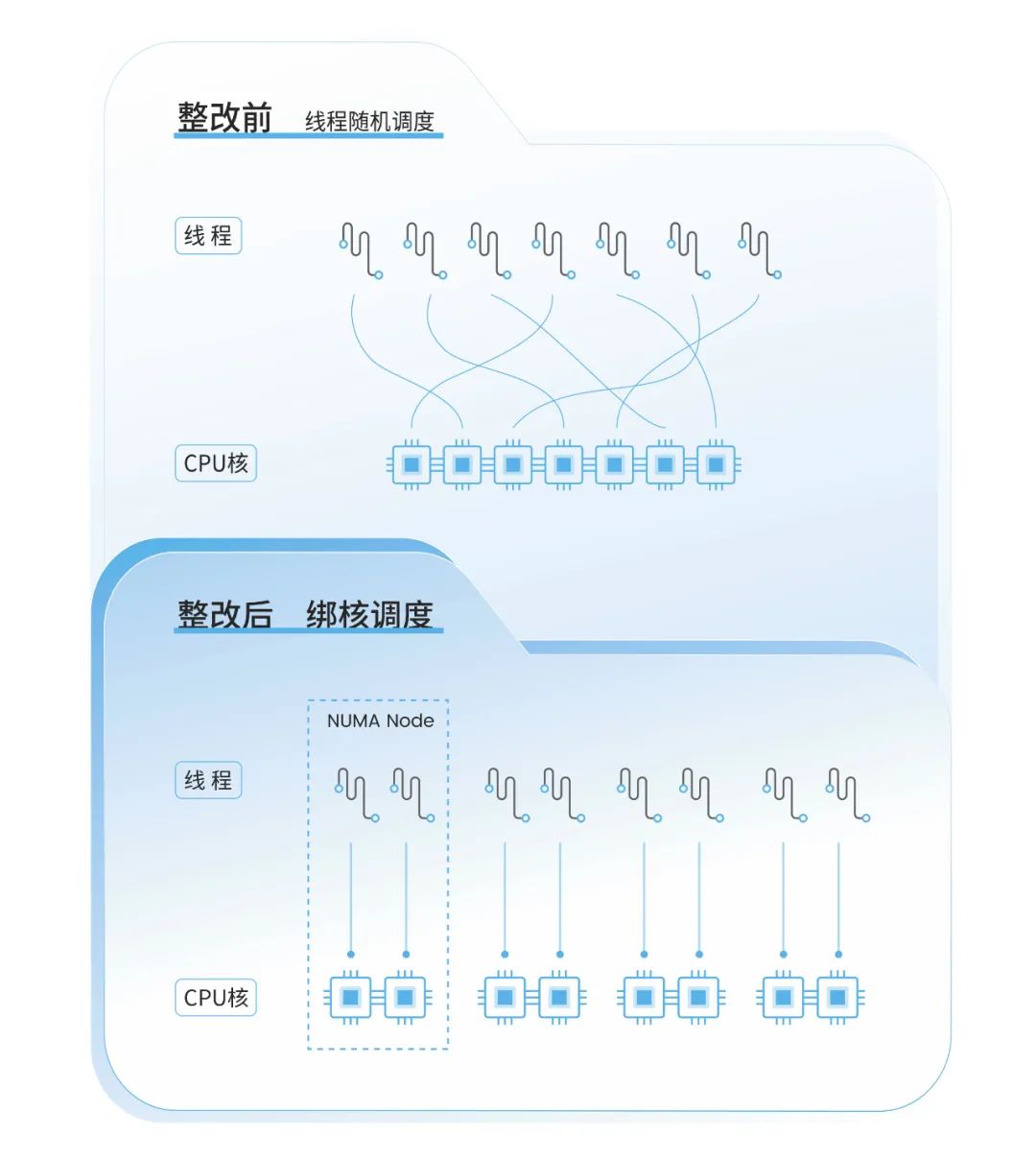 防止线程飘移,让其实现CPU核的就近访问,这是降低访问时延的关键,因此采用将线程能够固定到具体的核上运行的方法。KingbaseES利用配置参数设定,利用操作系统设置亲和性接口达到将线程绑定到具体NUMA节点上的效果。