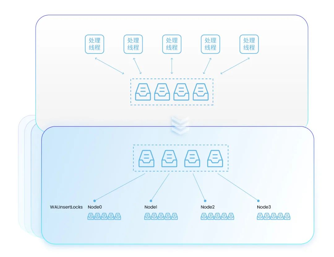KingbaseES因业务处理需要,涉及很多对全局性数据结构的操作,如WALInsertLock、PGPROC等,在NUMA架构下,优化前,此类数据结构存放在共享内存中,当出现高并发访问,访问竞争激烈时,就会存在对其跨核访问,形成访问远端内存的局面,造成性能消耗。