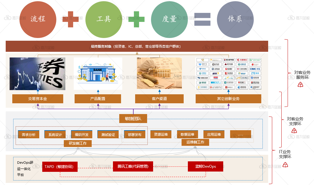 明确建设思路和方案后,中金财富脚踏实地,采取分步实施策略,通过流程+工具+度量三方面的建设,为企业打造成熟的DevOps能力体系,构建IT支撑环、业务支撑环、业务服务环三大闭环,实现组织“业务、信息、价值”全贯通,助力企业数字化转型。