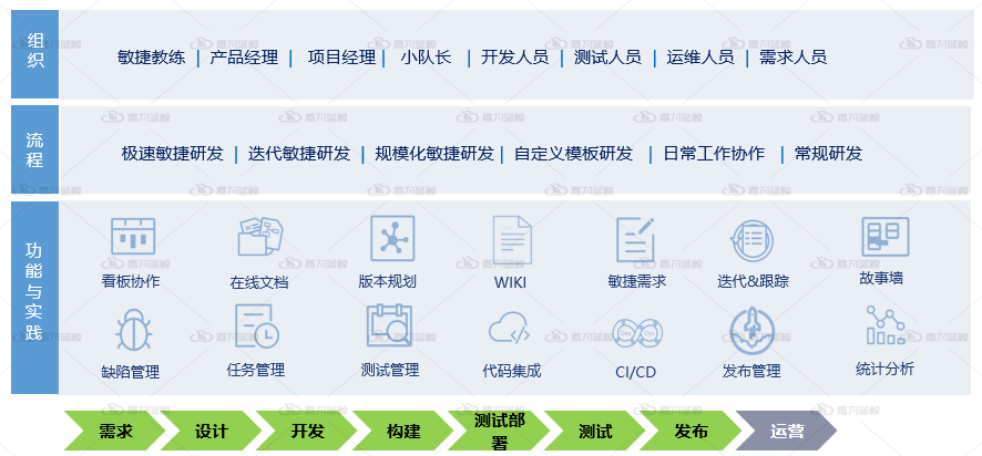 中金财富转型第一步,是敏捷组织建设和流程的规范化。建立适用于各类型业务形态的交付流程和标准规范,是研运体系有序运行的基础保障。通过部署DevOps平台,建设流程管理体系,以规范的交付流程为敏捷化转型的逐步推进保驾护航,实现各团队沟通协作,小步迭代保障业务贯通以及研发流程稳定、有序进行。
