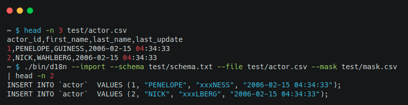 至此仅实现了把数据库中的数据脱敏后共享给使用方的需求,如果有同学给了一份未脱敏的数据文件让你导入到测试环境呢?d18n 也支持对 Excel、TXT、CSV、HTML、JSON 等格式的文件进行二次脱敏生成 SQL,可生成 SQL 文件,也可直接连接数据库导入至数据库中查看。