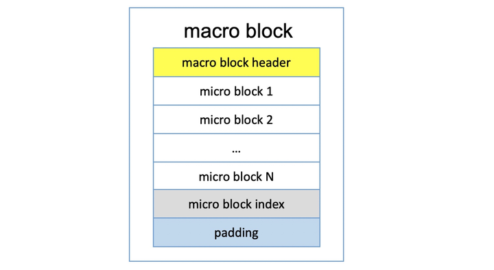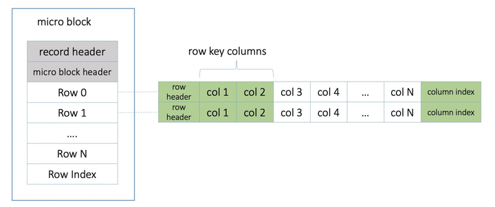 OceanBase 数据库内部 IO 的最小单元就是微块,微块数据可以进行压缩,下图是微块在宏块中的存储格式: