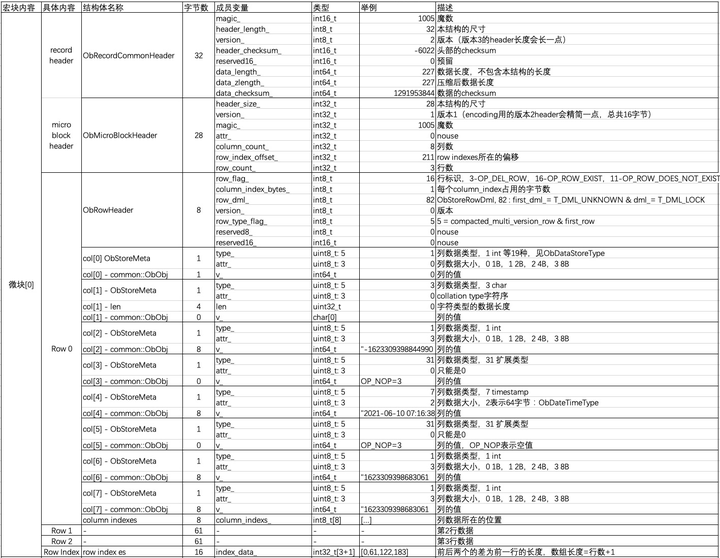 Row 0 表示第一行数据,ObRowHeader 主要记录每列索引占用的字节数(column_index_bytes),列索引的偏移量是通过行索引得出第一行的偏移和长度往前推8字节(column_count * column_index_bytes)得出来的。