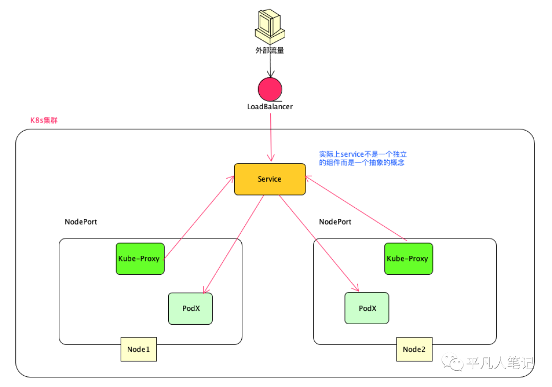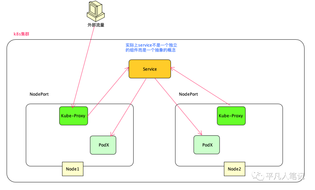 先访问NodePort端口 然后通过Kube-Proxy转发到内部的Service抽象层