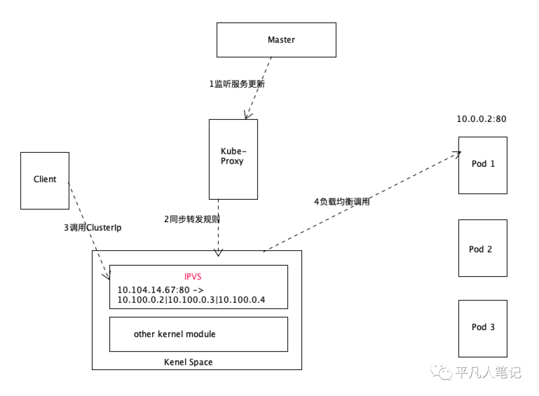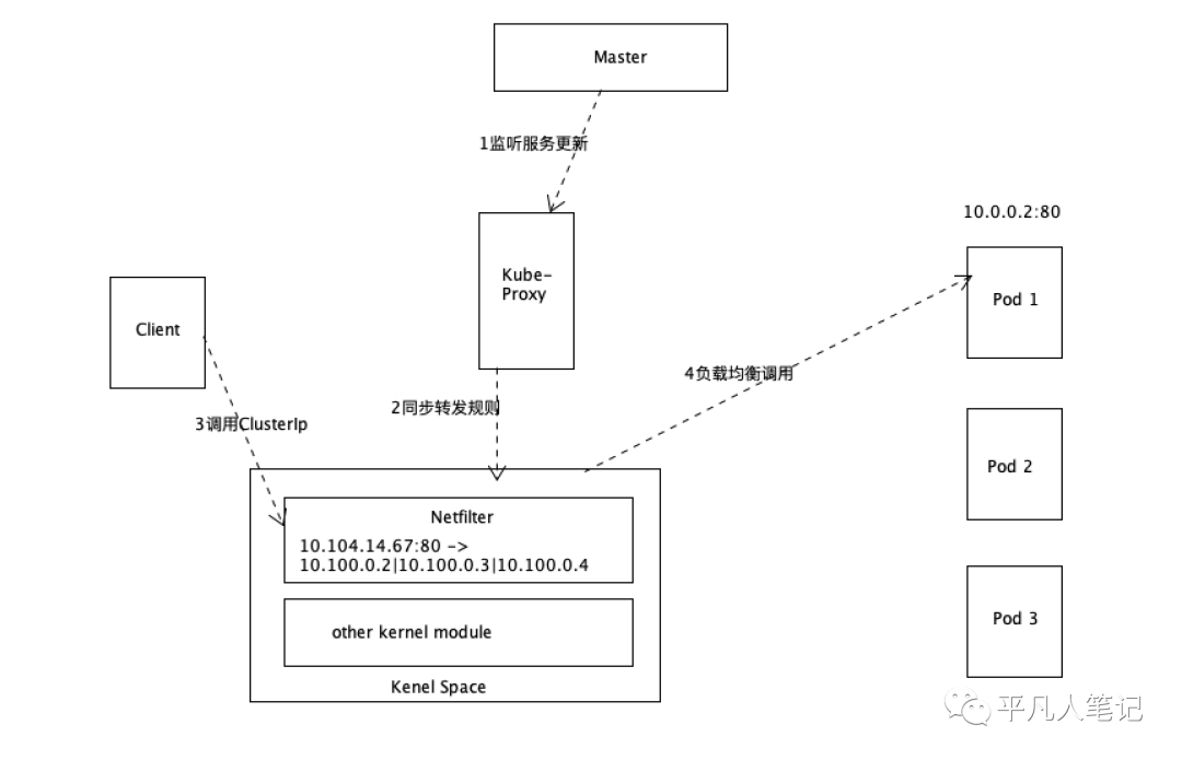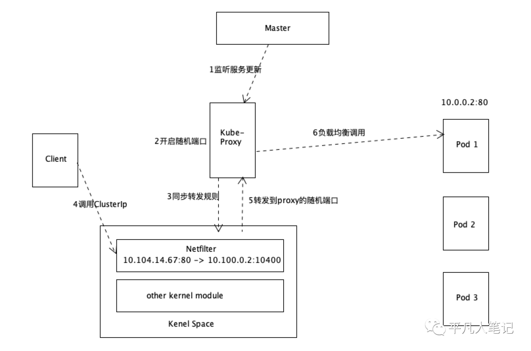 2、当有一个类型为clusterip的新服务被创建 kube-proxy通过iptables直接设置转发规则 并直接负载均衡转发到目标pod上面