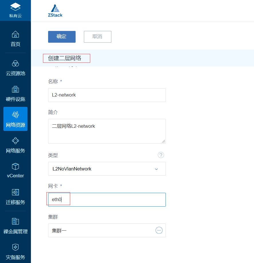 1. 创建二层公有网络,添加物理网卡名,并加载此二层网络到相应集群。要确保二层网络加载到有物理机的集群,ZStack有区域,集群,二层网络、主存储等资源,这里的二层网络要在集群上进行加载。
