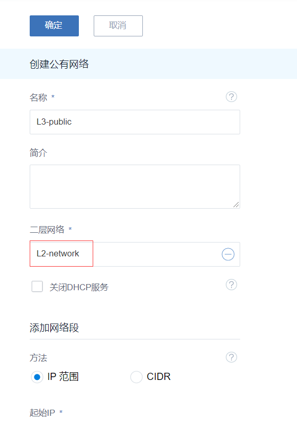 2.创建三层公有网络,注意网关不可以在ip段中,这里需要解释一下:
