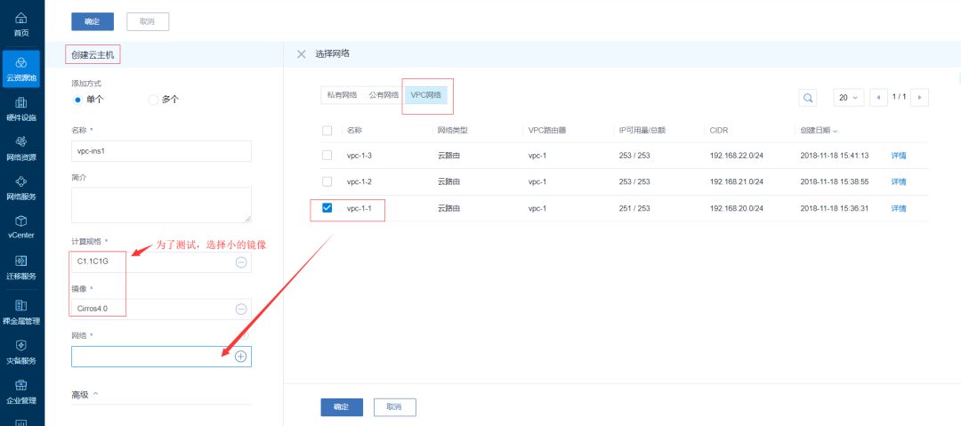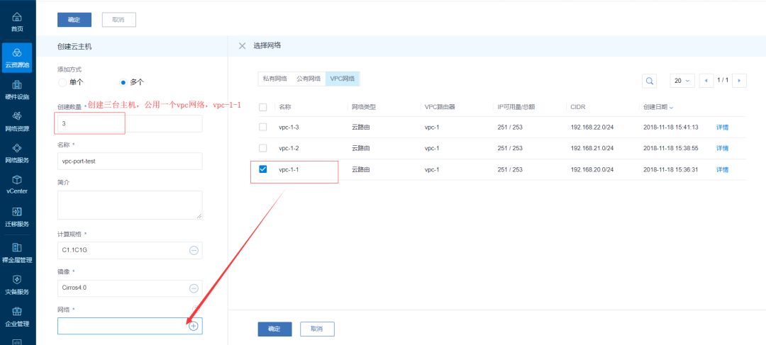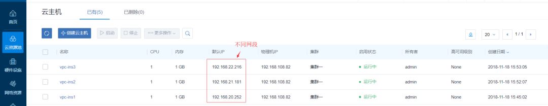 6.使用VPC网络创建云主机。创建三台如图vpc-ins1,vpc-ins2,vpc-ins3,网络分别选取vpc网络中的vpc-1-1、vpc-1-2、vpc-1-3