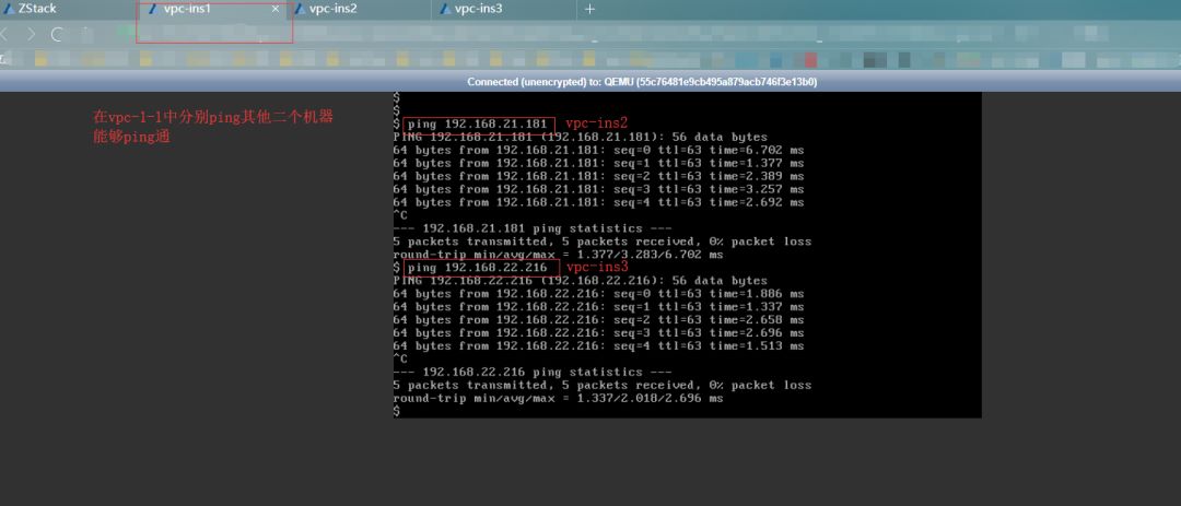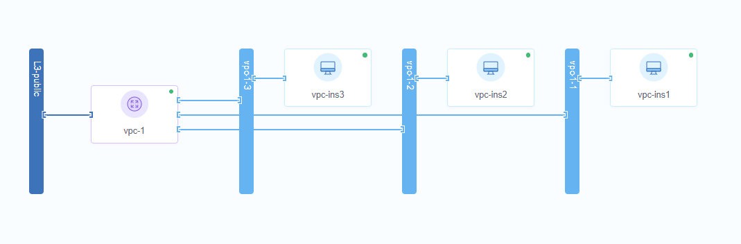 可知,3个vpc私有网络分别对应三个云主机,则三个的网络段都不同,在二层是完全隔离的网络,但在三层上来看,它们的网关是放在vpc路由器上面的。则它们通过网关实现互联互通。