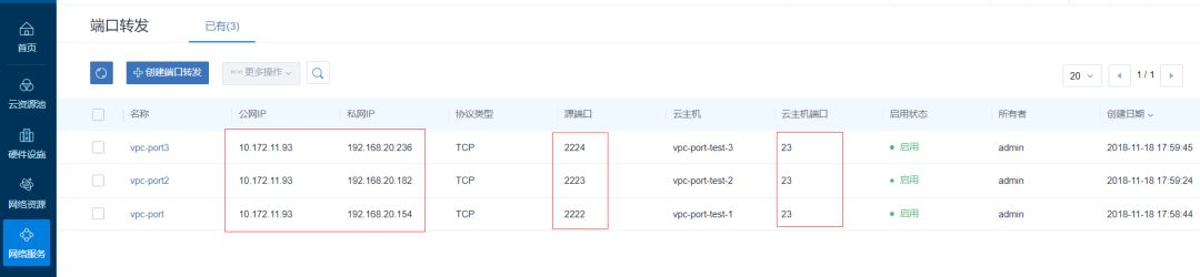 同样的,再根据第一个示例,创建二个端口转发,这是需要选择已有的虚拟ip,即第一次创建的,源起始端口分别为2223和2224,云主机起始端口为23,再绑定云主机网卡。最后三个端口转发配置如下: