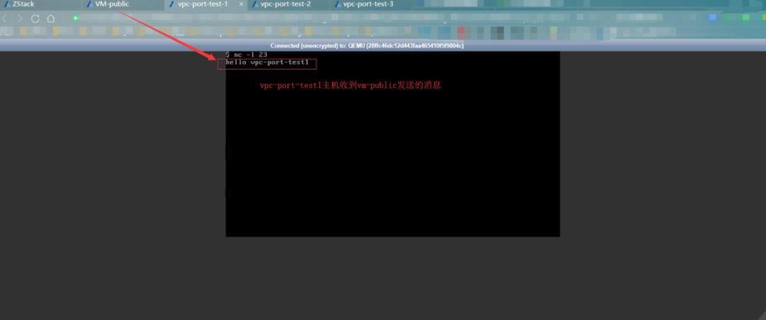 如:在公有网络下的云主机输入nc 10.172.11.93 2222,接下来发送消息hello vpc-port-test1,在vpc网络中的对应2222端口的主机vpc-port-test1收到这个消息。